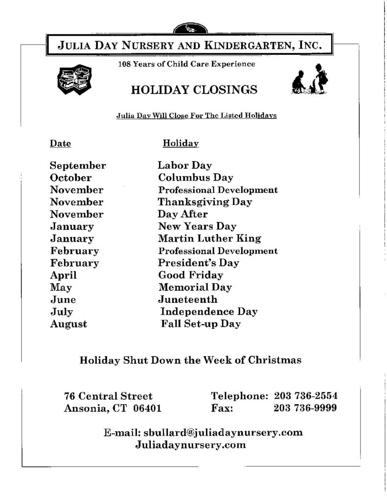 - At this time Julia Day does not offer a full time Kindergarten Program